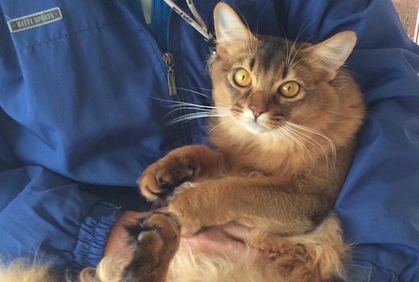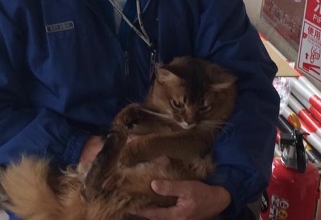 スカイ君はパパさんに抱っこされています。避難所の入り口付近にメイプルちゃんとケージ(別々ですが)で過ごしていますが、お昼間はパパやママと車の中で少し遊んでもらっているそうです。