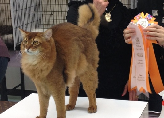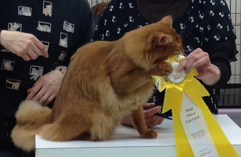 ソマリは成長がとても遅いですが、ノーム君の血統は早くから色上がりあり、持ち前のバランスの良さががキツンの時、アメリカのジャッジの方に高く評価して頂きました。