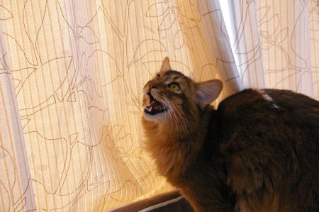 彼はカーテンの隙間からお日様を浴びていました><