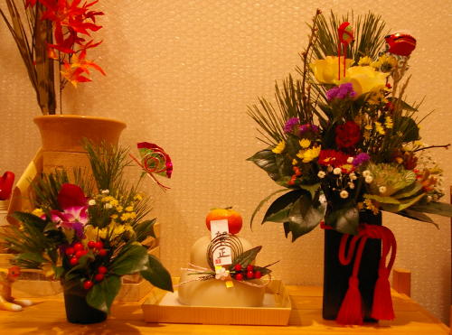 今年はお隣様のおば様が手作りしてくださったお花を飾り、お餅も飾ってみました。