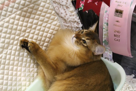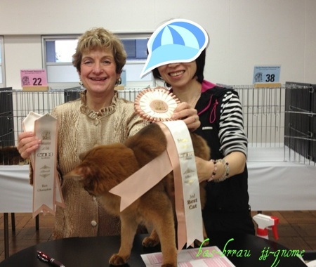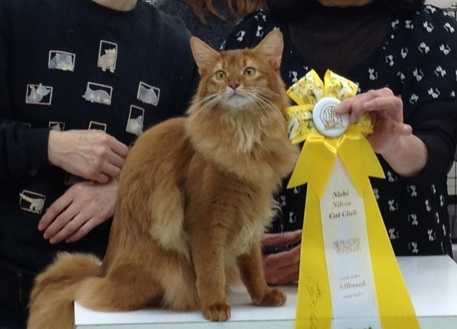 ソマリは成長がとても遅いですが、ノーム君の血統は早くから色上がりあり、持ち前のバランスの良さががキツンの時、アメリカのジャッジの方に高く評価して頂きました。